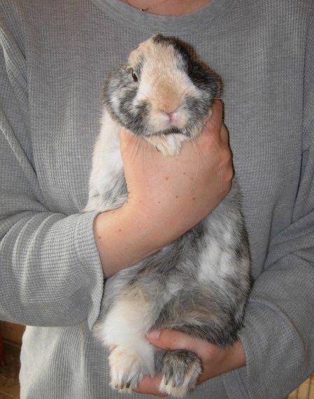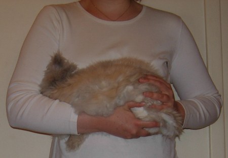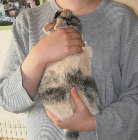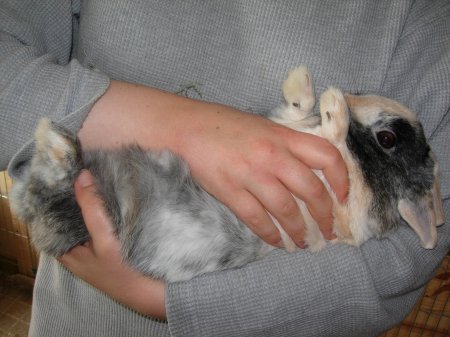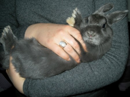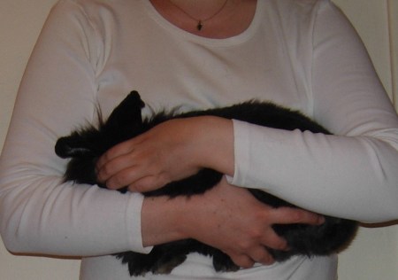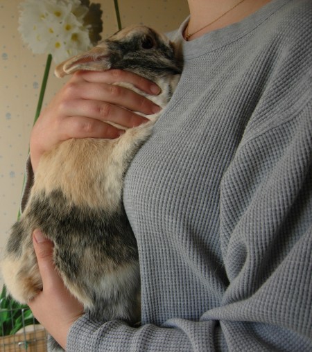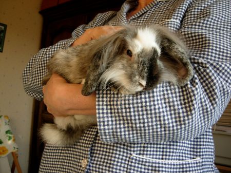 A la maison, seuls deux de mes lapins n’aimaient vraiment pas être portés lorsqu’ils sont arrivés : Tarquin et Hermès. Leurs précédentes propriétaires m’avaient indiqué qu’elles n’étaient pas très à l’aise pour les prendre dans les bras et que l’une d’elle avaient malencontreusement laissé tomber Hermès par terre un jour. Cette chute explique sans doute les craintes de ces deux lapins par la suite. De fait, Tarquin se débattait comme un beau diable dès que je le prenais dans les bras et Hermès se mettait à faire des grognements respiratoires, tant il était stressé (à tel point que j’ai cru qu’il était malade quand je l’ai adopté). Toutefois, avec le temps, Tarquin et Hermès ont pris l’habitude d’être portés dans les bras en restant détendus.