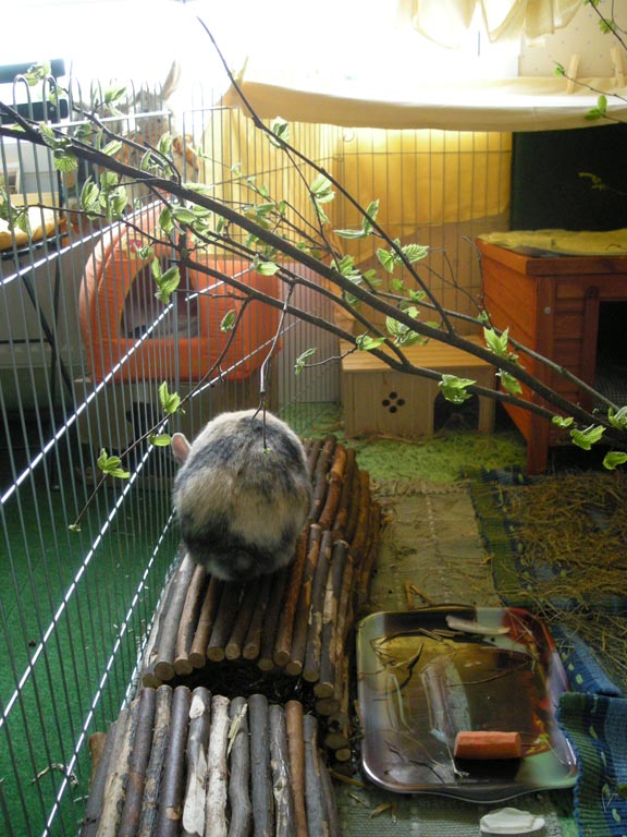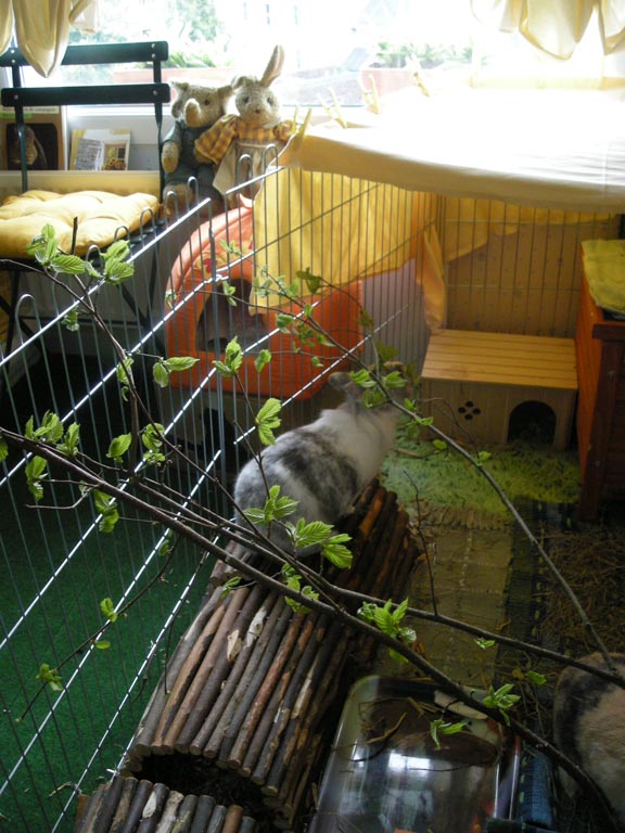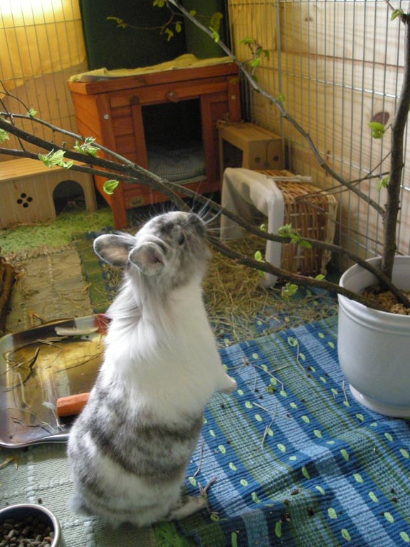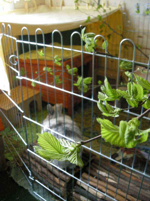 C’est le printemps! C’est donc la bonne période pour donner de jeunes branches de noisetier à votre lapin, un mets particulièrement apprécié des lapins (assurez-vous toutefois que le noisetier n’est pas traité avant d’en donner à votre lapin).